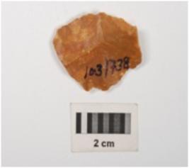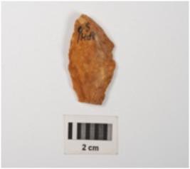 | Description / विवरण | A chert blade with a mid ridge on dorsal side, bulb on ventral side, broken along at distal end and right dorsal side, triangular in section. |