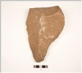 | Description / विवरण | Handaxe made on side-struck sandstone flake, prominent bulb on ventral surface, wavy cutting edges, flake scars on one surface, pointed at one end. |