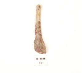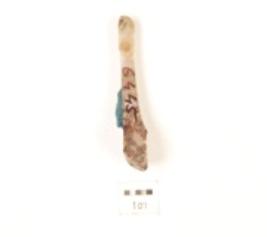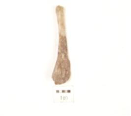 | Description / विवरण | Flake made on chert with distal end broad and thick proximal end narrow with a striking platform and a positive bulb on ventral side, sharp edge, triangular cross section. |