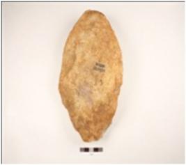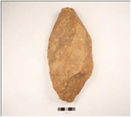 | Description / विवरण | Handaxe made on pebble quartzite, flake scars on both surface wavy cutting edges, biconvex in section. |
