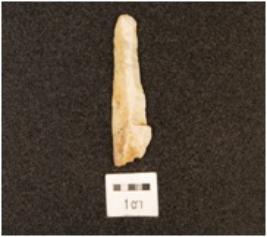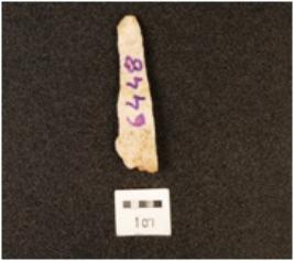 | Description / विवरण | Blade with a middle ridge on dorsal side, positive bulb on ventral side of proximal end, triangular cross section, use wear marks on working edge. |