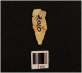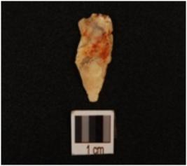 | Description / विवरण | Flake with a positive bulb on one side, part of striking platform visible, thin section. |