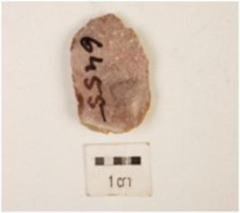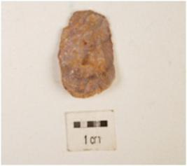 | Description / विवरण | Utilized flake with striking platform on one end, prominent bulb on ventral side, flake scars on surface, use wear marks on edges. |