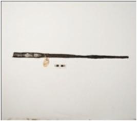 | Description / विवरण | Fragment of long shaped iron spear, broken into two pieces, uneven surface, chemically treated surface. |
