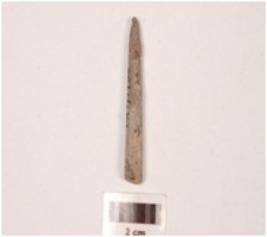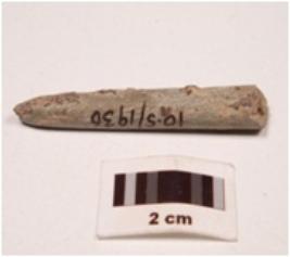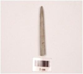 | Description / विवरण | A fragment of a pointe stone, circular in section, slightly broken at one end, pointed broken at other end, greyish colour, smooth surface. |