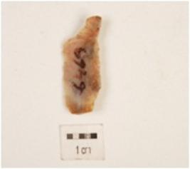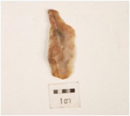 | Description / विवरण | Flake with a striking platform on one end with a prominent bulb on ventral side, flake scars on one side, plano-convex cross section. |