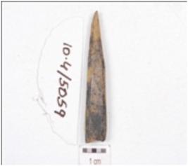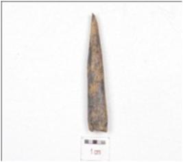 | Description / विवरण | A fragment of point made on bone, working end is slightly chipped off, upper part is broken and circular cross section. |