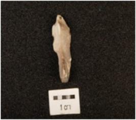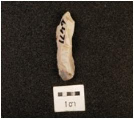 | Description / विवरण | Flake with a triangular cross section, flake scars on surface, striking platform on one side, near prominent bulb. |