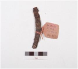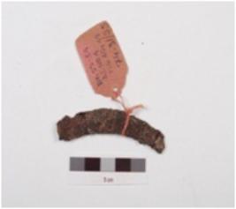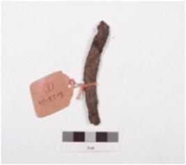 | Description / विवरण | Fragment of an iron sickle, slightly rusted surface, mended at both the ends. |