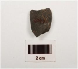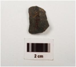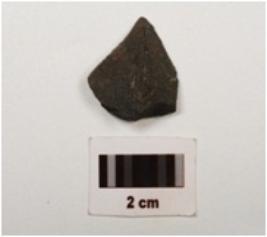 | Description / विवरण | A basalt flake with flake scars, ridge on surface and use wear marks on edges pointed at one end, |
