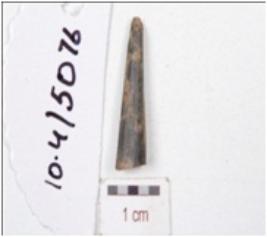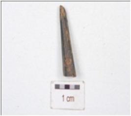 | Description / विवरण | A fragment of point made on bone, working end is slightly chipped off, upper part is broken and circular cross section. |