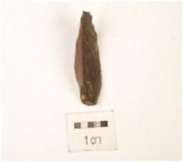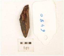 | Description / विवरण | Flake with a triangular cross, prominent bulb near striking platform, slightly chipped off. |