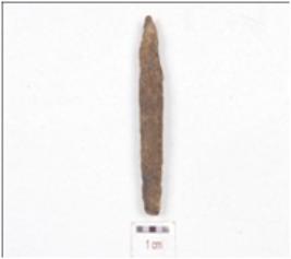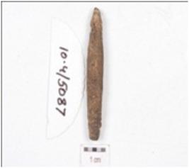 | Description / विवरण | A fragment of point made on charred bone, working end is slightly chipped off, upper part is broken and circular cross section. |