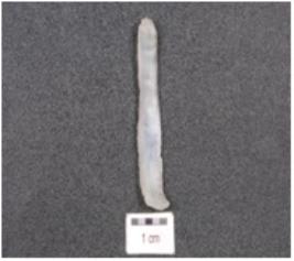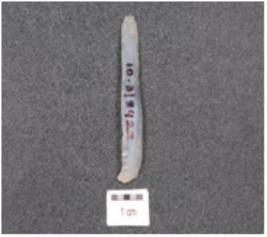 | Description / विवरण | Parallel sided blade made on chalcedony, prepared platform, prominent bulb and use wear marks on the working edges. |