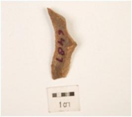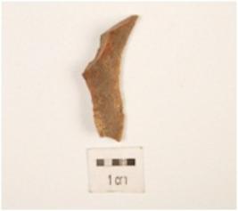 | Description / विवरण | A fragment of flake made by chert, flake scars on the surface, prepared platform on the proximal end and distal end pointed, use wear marks on one cutting edge. |