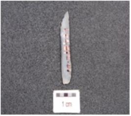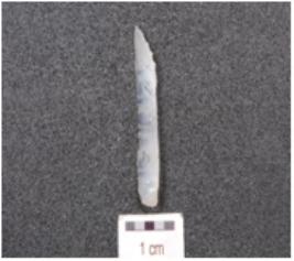 | Description / विवरण | Parallel sided blade, made on chalcedony, prepared platform, diffused bulb and use wear marks on the working edges. |