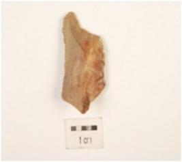 | Description / विवरण | A scraper made by chert, flake scars and cortex on the surface, prominent bulb on the ventral side, and partly retouching on the cutting edges. |