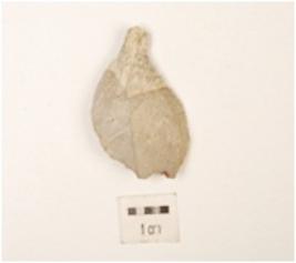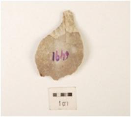 | Description / विवरण | A chert scraper made on side struck flake, prominent bulb on the ventral side, flake scars and cortex on surface, partly retouching on the cutting edges. |