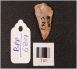 | Description / विवरण | Quartz flake, irr-regular shaped and use wear marks along the cutting edge. |