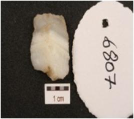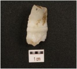 | Description / विवरण | Fragment of blade on chert, prepared platform, mid-ridge on dorsal side, and prominent bulb on ventral side, use wear marks along cutting edges, triangular in section. |