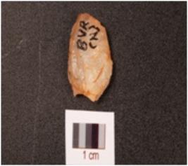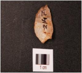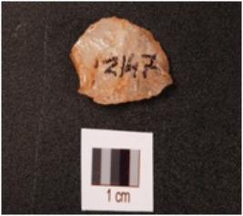 | Description / विवरण | A quartz end struck flake, diffused bulb on ventral side and prepared platform. |