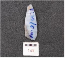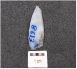 | Description / विवरण | A blunted blade made of chalcedony, flake scars both sides and use wear marks wavy cutting edges. |