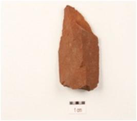 | Description / विवरण | A flake made on chert, uneven in surface, irregular in shape, flake marks on surface, use wear marks on surface, prepared platform on dorsal side. |