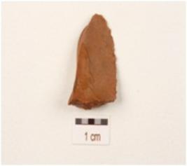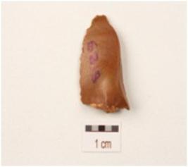 | Description / विवरण | A flake made on chert, uneven surface, and irregular in shape, use wear marks on edges. |