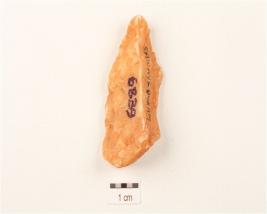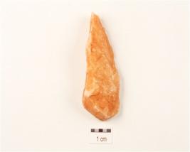 | Description / विवरण | A flake made on chert, prepared platform on proximal end and mid ridge on dorsal side, use wear marks on edges. |
