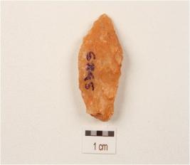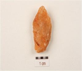| Description / विवरण | A flake made on quartz, uneven surface, one end is pointed, use wear marks on edges. |