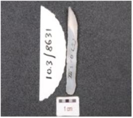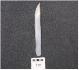 | Description / विवरण | A chalcedony blade, trapezoidal cross section, pointed distal end, prepared platfrom, bulb absent and use wear marks along the cutting edges. |