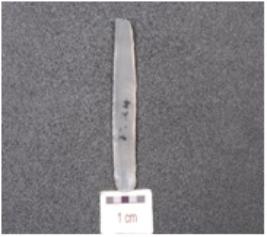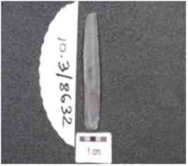 | Description / विवरण | A chalcedony blade, trapezoidal cross section, prepared platform, prominent bulb and ripple marks on ventral side and use wear marks along the cutting edges. |