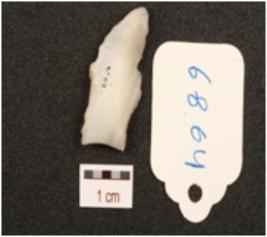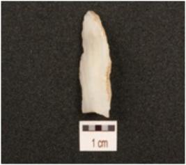 | Description / विवरण | A blade made a side struck flake of chalcedony, tapering sides ends to a point, single ridged, diffused bulb at ventral side, regular retouching of the working edges. |