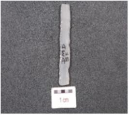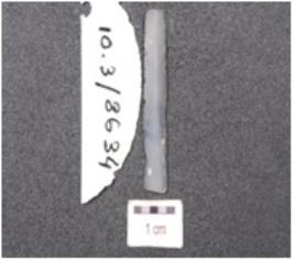 | Description / विवरण | A parallel sided blade, chalcedony blade, trapezoidal cross section, prepared platform, diffused bulb on ventral side and use-wear marks along the cutting edges. |