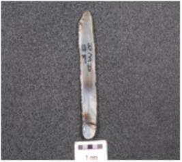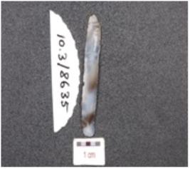 | Description / विवरण | A parallel sided blade, chalcedony blade, triangular cross section, prepared platform, prominent bulb on ventral side and use-wear marks along the cutting edges. |