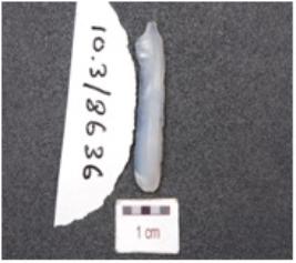 | Description / विवरण | A chalcedony blade, trapezoidal cross section, prepared platform, prominent bulb on ventral side and use-wear marks along the cutting edges. |