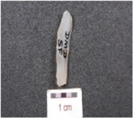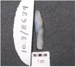 | Description / विवरण | A chalcedony blade, triangular cross section, prepared platform, prominent bulb on ventral side and use wear marks along the cutting edge. |