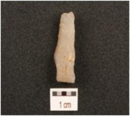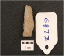| Description / विवरण | A side scraper made on a fluted flake of chalcedony, intact cortex on one side, prepared platform, uneven surface. |