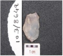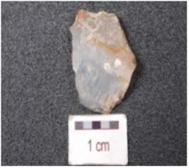 | Description / विवरण | A chalcedony end struck flake, prepared platform and prominent bulb on ventral side. |