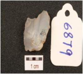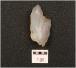 | Description / विवरण | A side scraper made on a side struck chalcedony flake, prepare platform, prominent bulb at ventral side, cross flake scars on dorsal side, retouched working edges. |
