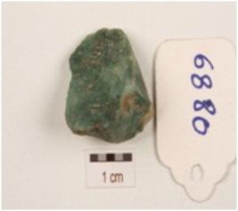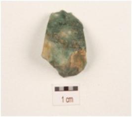 | Description / विवरण | An end scraper made on core of green jasper, plain sides, irregular flake scars on butt end, regular retouching at working edge. |