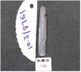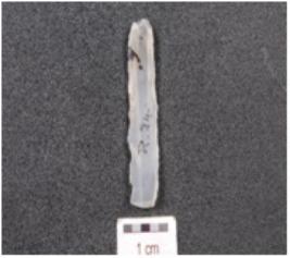 | Description / विवरण | A parallel sided microlithic blade of chalcedony, use marks along the cutting edges and broken at distal end. |