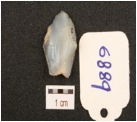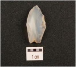 | Description / विवरण | An end scraper made on an end struck chalcedony flake, cross flake scars on surface, prepared platform, depression on the ventral side, retouched working edge. |