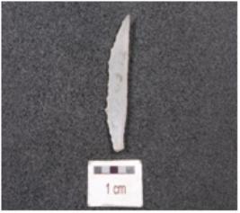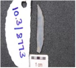 | Description / विवरण | A lunate made on chalcedony, baked along one lateral side and pointed at one end. |