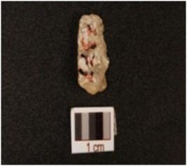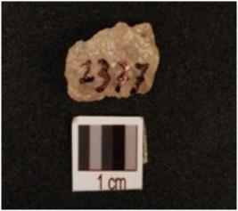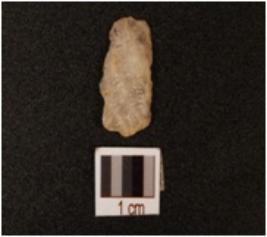 | Description / विवरण | A modified flake, made on quartz, irregular edges, distral end is broken, defused bulb on proximal end, dorsal side is uneven. |