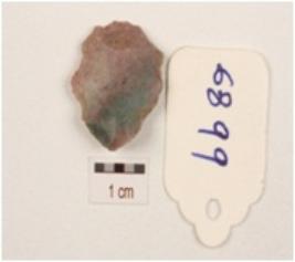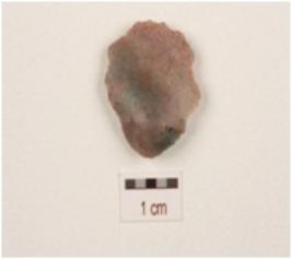 | Description / विवरण | A side scraper made on an end struck flake of green jasper, prepared platform, prominent bulb at ventral side, cross flake scars on dorsal sides, regular retouching of the working edges. |
