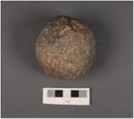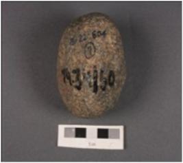 | Description / विवरण | A hammer stone made on granite, circular in shape, partly smooth surface with pitting marks and circular in section. |