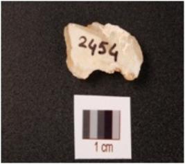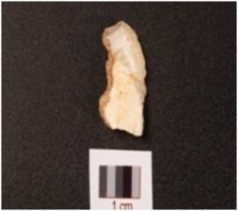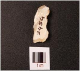 | Description / विवरण | Fragment of a blunted blade on agate, broken along proximal end, intact distal end, use-wear marks along cutting edges. |