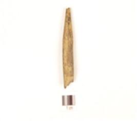 | Description / विवरण | Fragment of bone point, one end pointed with broken tip, other end broken, plano convex cross section, polished surface and black surface due to heat treatment. |