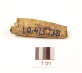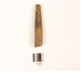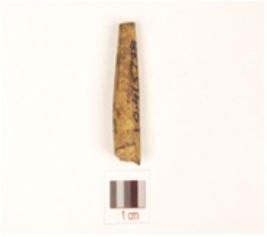 | Description / विवरण | Fragment of a bone point with oval cross section and polished black surface due to heat treatment. |